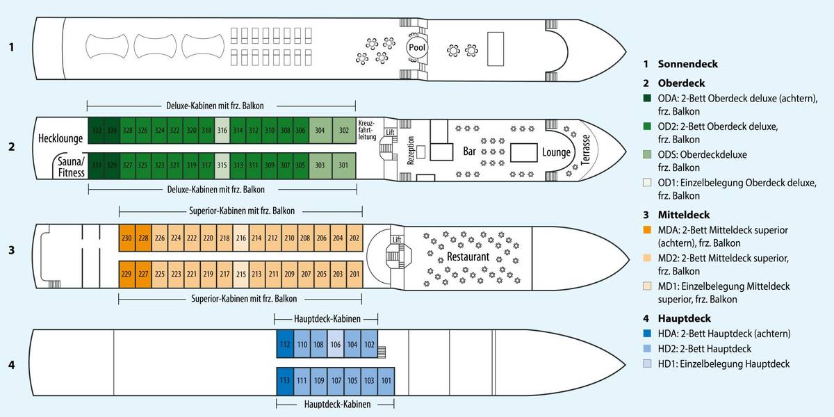 MS VistaBaroness erstrahlt neu im 1AVista-Design und empfängt Sie mit einem edlen, klassisch-maritimen Stil in einem behaglichen Ambiente. Das elegante Flussschiff bietet auf 110 m viel Platz und großzügige öffentliche Bereiche. Der Panoramasalon mit einer Außenveranda und die lichtdurchflutete Hecklounge laden zum Verweilen ein, auch ein kleiner Fitnessraum steht zur freien Verfügung. Ein herzlicher Service und die ausgezeichnete Küche, serviert im stilvollen Restaurant, runden Ihren Aufenthalt an Bord ab. Auf dem Sonnendeck mit Schattensegeln, Sonnenliegen und einem Whirlpool genießen Sie die vorbeiziehende Landschaft. Alle Kabinen und Suiten auf dem Mittel- und Oberdeck sind mit französischem Balkon ausgestattet. Herzlich willkommen an Bord!