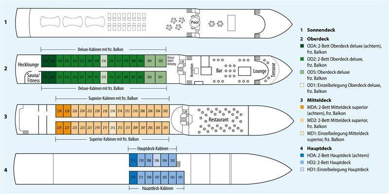 MS VistaBaroness erstrahlt neu im 1AVista-Design und empfängt Sie mit einem edlen, klassisch-maritimen Stil in einem behaglichen Ambiente. Das elegante Flussschiff bietet auf 110 m viel Platz und großzügige öffentliche Bereiche. Der Panoramasalon mit einer Außenveranda und die lichtdurchflutete Hecklounge laden zum Verweilen ein, auch ein kleiner Fitnessraum steht zur freien Verfügung. Ein herzlicher Service und die ausgezeichnete Küche, serviert im stilvollen Restaurant, runden Ihren Aufenthalt an Bord ab. Auf dem Sonnendeck mit Schattensegeln, Sonnenliegen und einem Whirlpool genießen Sie die vorbeiziehende Landschaft. Alle Kabinen und Suiten auf dem Mittel- und Oberdeck sind mit französischem Balkon ausgestattet. Herzlich willkommen an Bord!