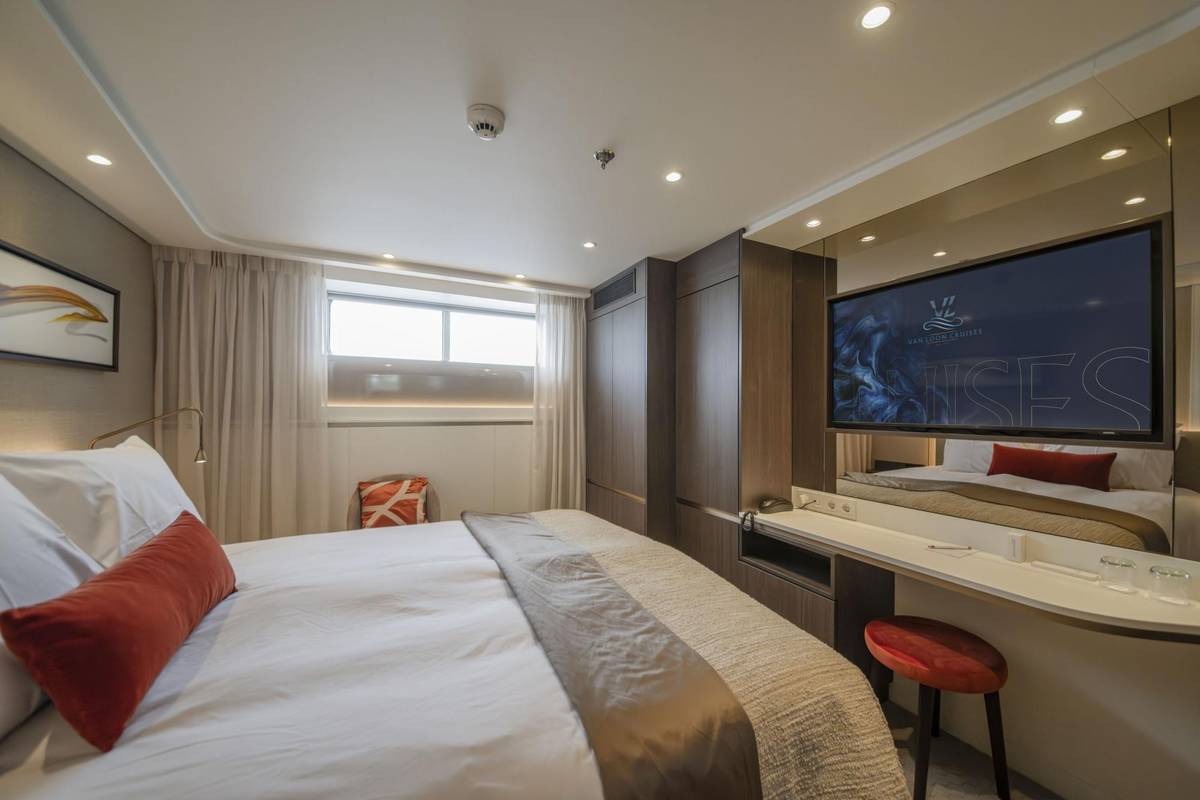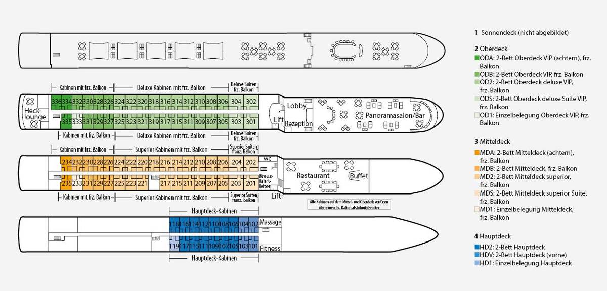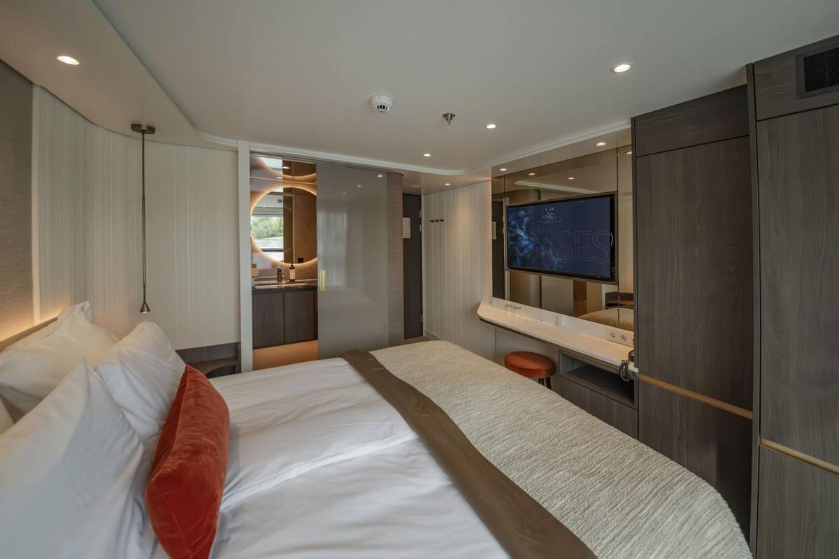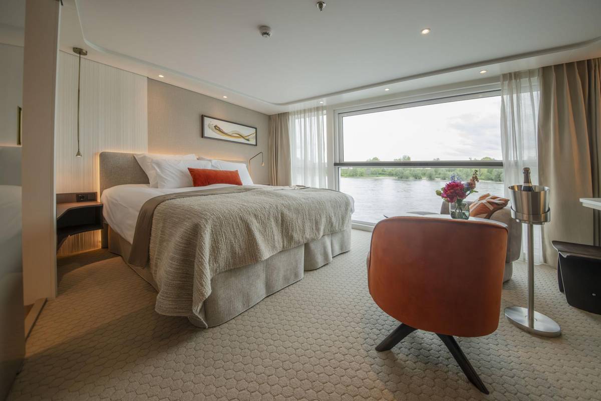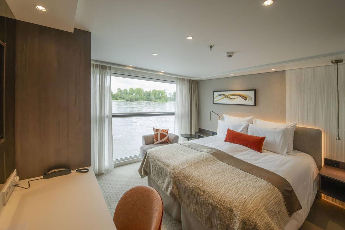 Alle Kabinen sind Außenkabinen und auf dem Mittel- und Oberdeck mit bodentiefen Panoramafenstern zum Öffnen (frz. Balkon als Infinity Fenster) ausgestattet. Die Mittel- und Oberdeckkabinen sind ca. 14 m², die Deluxe Kabinen ca. 16m² groß. Die geräumigen Suiten bieten ca. 21 m² Platz. Die kleineren Fenster der Hauptdeckkabinen (ca. 13 m²) können nicht geöffnet werden. Alle Kabinen sind modern und geschmackvoll mit hochwertiger Ausstattung eingerichtet: DU/WC, Föhn, Doppelbett (separierbar), Sat.-TV, Telefon, Klimaanlage/Heizung, Safe, Minibar. Kabinen mit VIP-Service erhalten zur Begrüßung einen Obstteller und eine Flasche Sekt. In begrenzter Anzahl können 2-Bett-Kabinen zur Alleinnutzung gebucht werden; Zuschlag + 70 %.