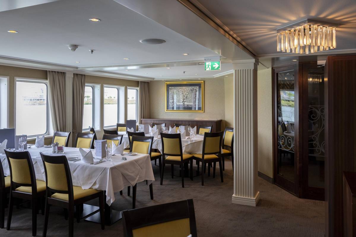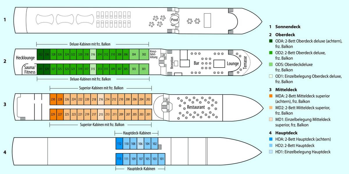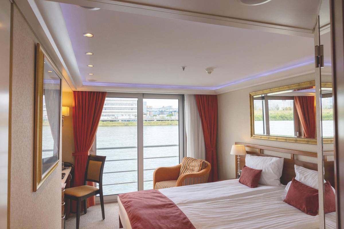 Alle Kabinen sind Außenkabinen und auf dem Mittel- und Oberdeck mit bodentiefen Panoramafenstern zum Öffnen (frz. Balkonen) ausgestattet. Die Mittel- und Oberdeck-Kabinen sind ca. 15 m², die Suiten ca. 23 m² groß. Die kleineren Fenster der Hauptdeck-Kabinen (ca. 15 m²) können nicht geöffnet werden. Alle eleganten und behaglichen Kabinen sind mit hochwertiger Ausstattung eingerichtet: DU/WC, Föhn, Doppelbett (separierbar), Sat.-TV, Telefon, individuell regulierbare Klimaanlage/Heizung, Safe. In den Suiten befindet sich zusätzlich ein Mini-Kühlschrank. Kabinen und Suiten auf dem Oberdeck erhalten zur Begrüßung einen Obstteller und eine Flasche Sekt. In begrenzter Anzahl können zusätzliche 2-Bett-Kabinen zur Einzelbelegung gebucht werden: Zuschlag + 70%.