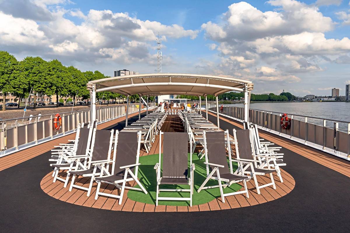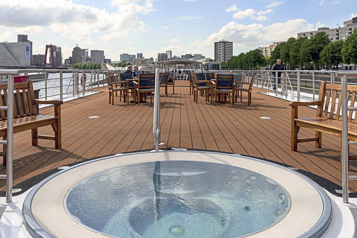 Weitläufiges Sonnendeck mit Whirlpool, Schattenplätzen, Outdoor-Möbeln und Liegen. Moderner Panoramasalon mit Bug-Terrasse, Hecklounge, Fitnessbereich mit kleiner Sauna, stilvolles Restaurant, Empfang mit Rezeption und Kreuzfahrtleiterdesk, Aufzug zwischen Oberdeck, Lobby, Mitteldeck und Restaurant (nicht zu den Hauptdeck-Kabinen).