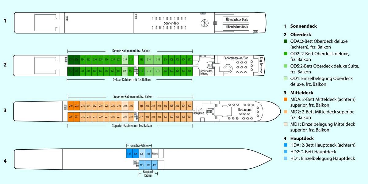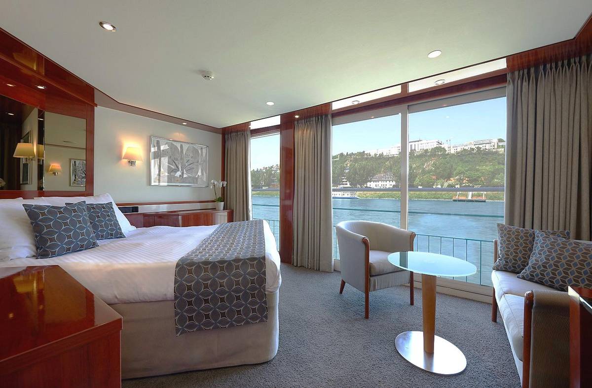 Alle Außenkabinen sind 14-15 m² groß und auf dem Mittel- und Oberdeck mit bodentiefen Panoramafenstern zum Öffnen (frz. Balkonen) ausgestattet. Die Suiten verfügen auf ca. 20 m² zusätzlich über ein Sofa und Marmorbad. Die kleineren Fenster der Hauptdeck-Kabinen (Bullaugen) können nicht geöffnet. Alle behaglichen Kabinen sind mit hochwertiger Ausstattung eingerichtet: DU/WC, Föhn, Doppelbett (separierbar), Sat.-TV, Telefon, individuell regulierbare Klimaanlage/Heizung, Safe, Minikühlschrank. Kabinen auf dem Oberdeck und Suiten erhalten zur Begrüßung einen Obstteller und eine Flasche Sekt. In begrenzter Anzahl können zusätzliche 2-Bett-Kabinen zur Einzelbelegung gebucht werden: Zuschlag +70%.