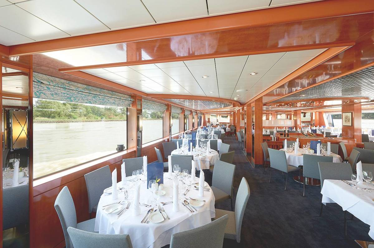 An Bord empfängt Sie ein freundlicher Eingangsbereich mit Rezeption und Kreuzfahrtleiterdesk. Der helle Panoramasalon mit Bar und angrenzender Bug-Terrasse bietet angenehme Rückzugsorte mit Blick auf die vorbeiziehende Flusslandschaft. Für die Mahlzeiten steht ein großzügiges Restaurant zur Verfügung. Ergänzt wird das Bordangebot durch einen kleinen Souvenirshop, eine Bibliothek mit Leseecke sowie einen kompakten Fitnessraum. Das weitläufige Sonnendeck lädt mit Sonnen- und Windschutz, Liegestühlen sowie Sitzgelegenheiten mit Tischen zum entspannten Verweilen ein. Das gesamte Schiff ist klimatisiert. Alle Decks sind ausschließlich über Treppen erreichbar.