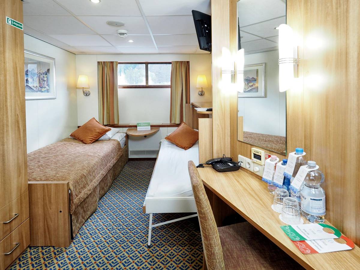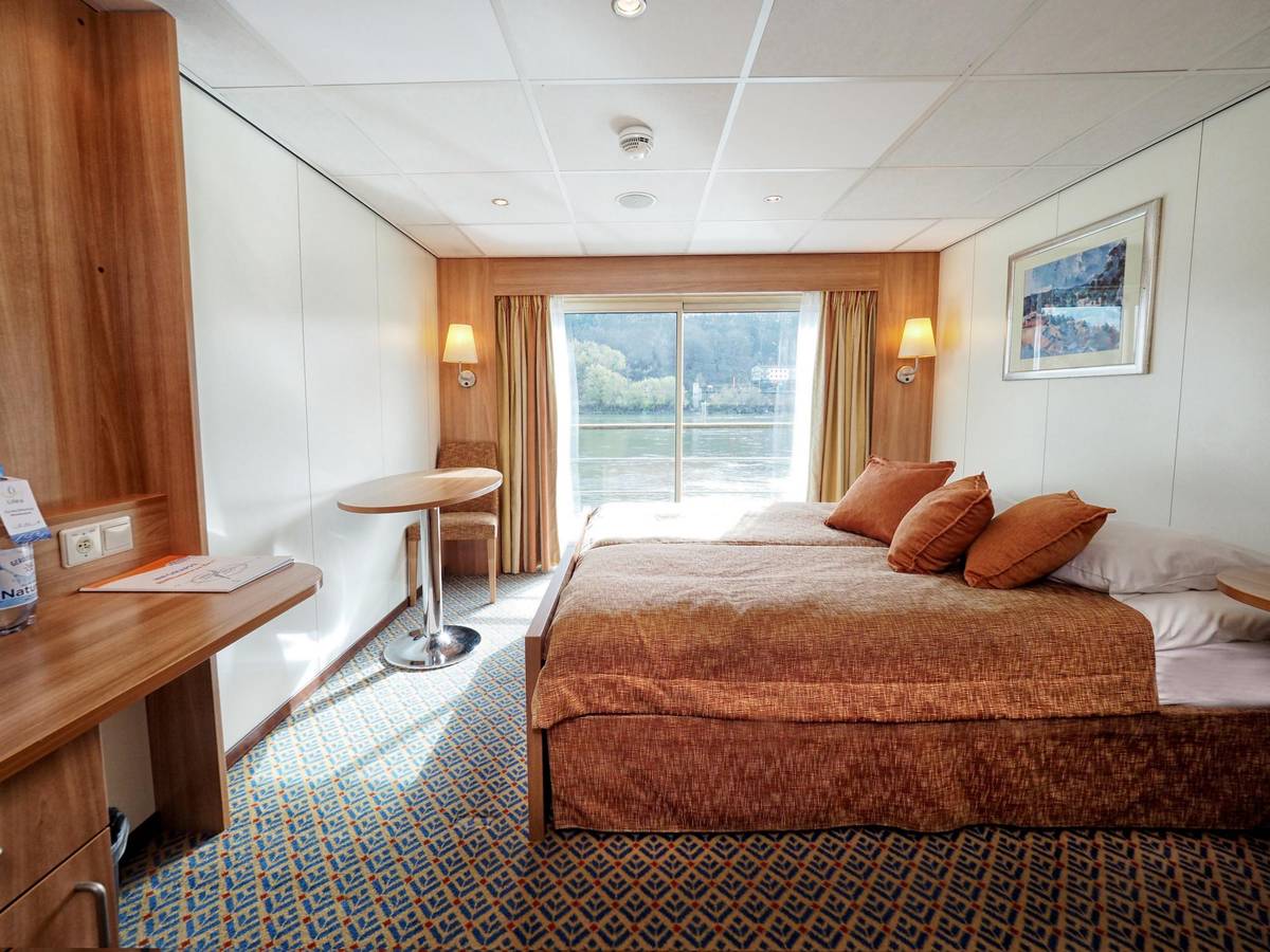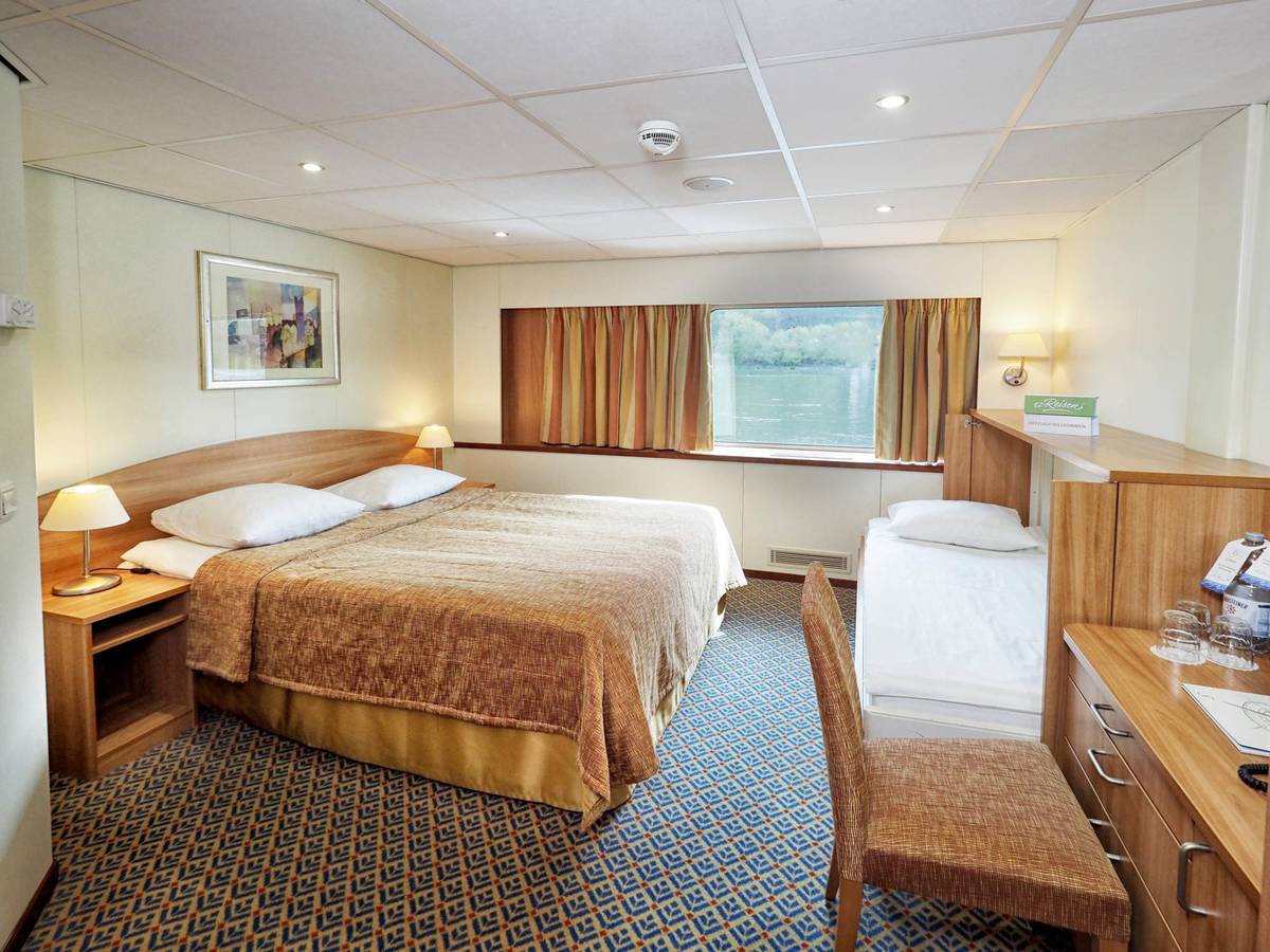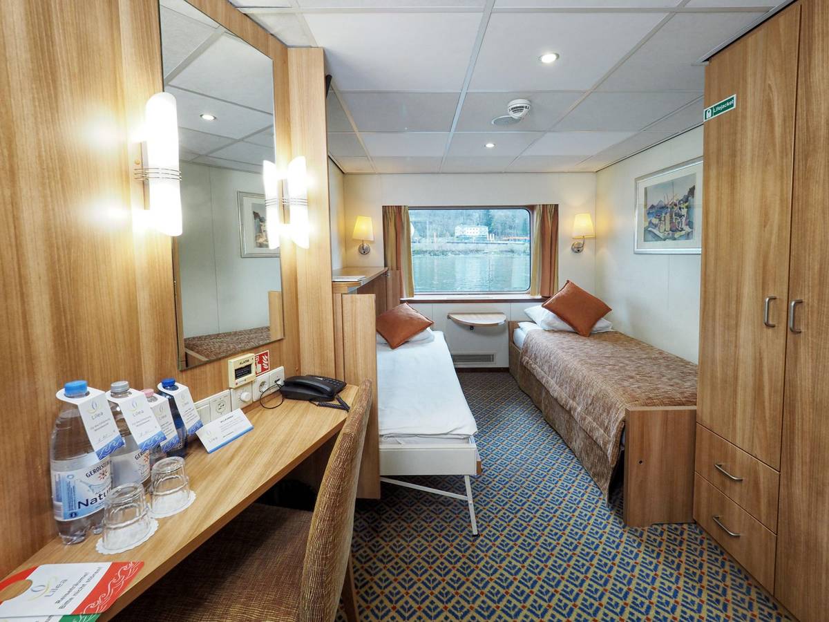 Alle Kabinen sind Außenkabinen und verfügen auf dem Mittel- und Oberdeck (Superior/Deluxe-Kabinen, ca. 14 m²) über zu öffnende bodentiefe Panoramafenster (frz. Balkon). Die Standard-Kabinen (ca. 11 m²) und Minisuiten (ca. 14 m²) auf dem Mitteldeck sind mit großen, nicht zu öffnenden Panoramafenstern ausgestattet. Die Kabinen auf dem Hauptdeck (ca. 11 m²) verfügen über kleinere Fenster, die nicht geöffnet werden können. In den Hauptdeck- und Standard-Kabinen auf dem Mitteldeck befinden sich zwei Einzelbetten, die Superior- und Oberdeckkabinen verfügen über ein Doppelbett (separierbar). In den Minisuiten befinden sich ein Doppelbett und ein unteres Wandklappbett (Kabine 221 zusätzlich mit oberem Wandklappbett). Alle Kabinen sind geschmackvoll und mit hochwertiger Ausstattung eingerichtet: DU/WC, Föhn, Sat-TV, Telefon, Klimaanlage, Safe, Schreibecke mit einer Sitzgelegenheit. Kabinen auf dem Oberdeck erhalten zur Begrüßung einen Obstteller und eine Flasche Sekt. In begrenzter Anzahl können zusätzliche 2-Bett-Kabinen zur Einzelbelegung gebucht werden; Zuschlag + 70 %