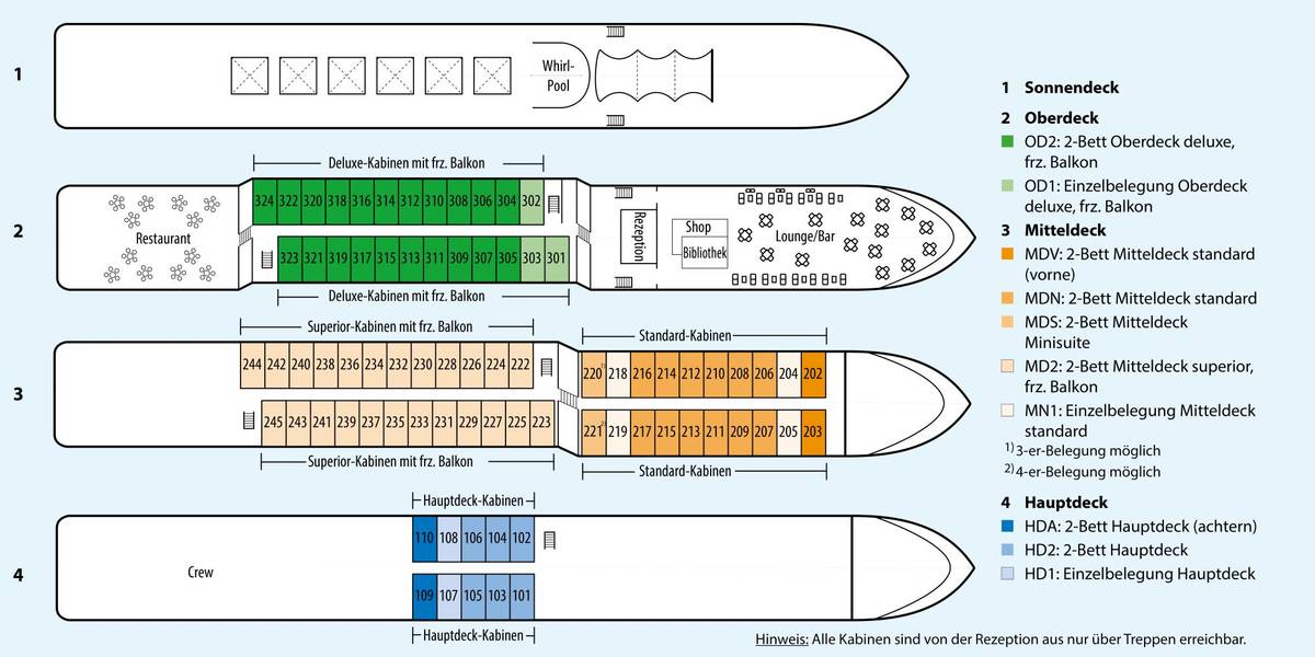 Hinweis: Alle Kabinen sind von der Rezeption aus nur über Treppen erreichbar.